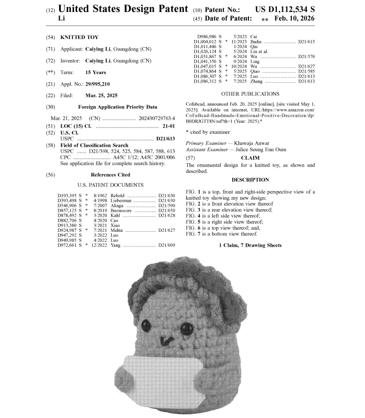 2月10日美国专利局公布一批最新下证美国外观专利,其中包含不少热销产品,比如在亚马逊上月销8K+且有大量同款在售的塔可针织玩偶。