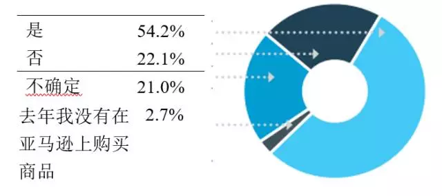 亚马逊的交易平台提供了商户跨境交易的机会。至少在美国,超过一半的受访者表示他们从国际零售商处购买商品。值得注意的是20%表示他们不确定是否买过。这表示至少部分消费者不关系他们从亚马逊的哪个卖家购买商品,因为对于他们来说亚马逊是一个信誉良好的购物站。