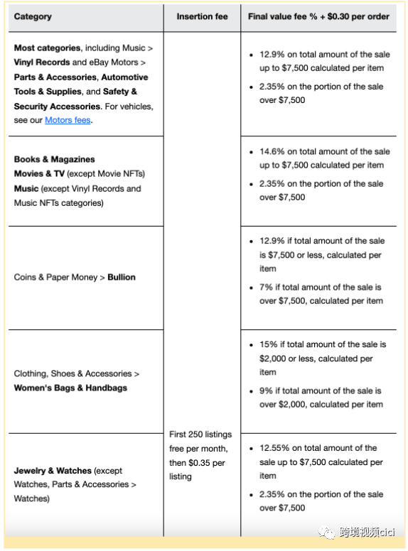 最终价值费用:一旦您的产品售出,eBay 会根据商品的最终售价收取一定比例。这包括运输和处理,但不包括销售税。