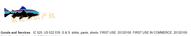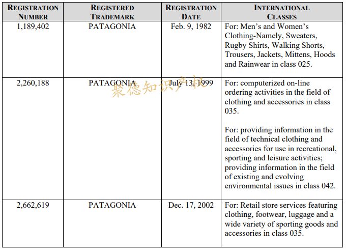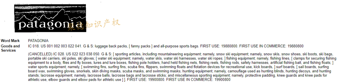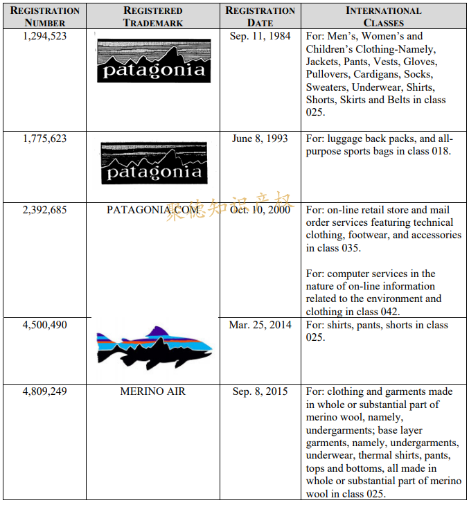 巴塔哥尼亚注册的商标有文字商标及图形商标,最早注册的商标“Patagonia”:1982年2月9日,第25类的男女服装:毛衣、橄榄球衫、运动短裤、长裤、夹克、连指手套、兜帽及雨衣。