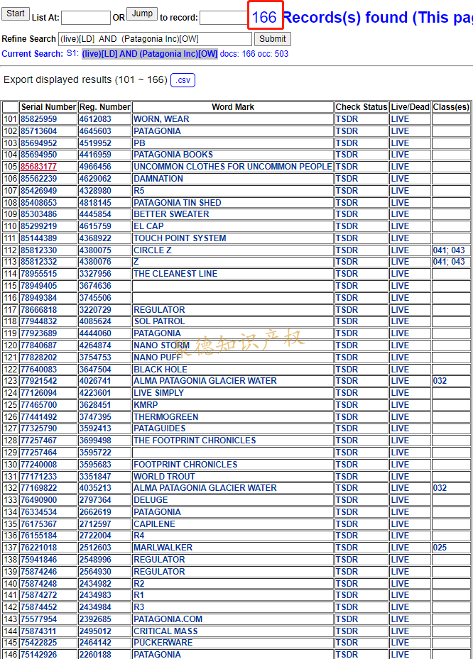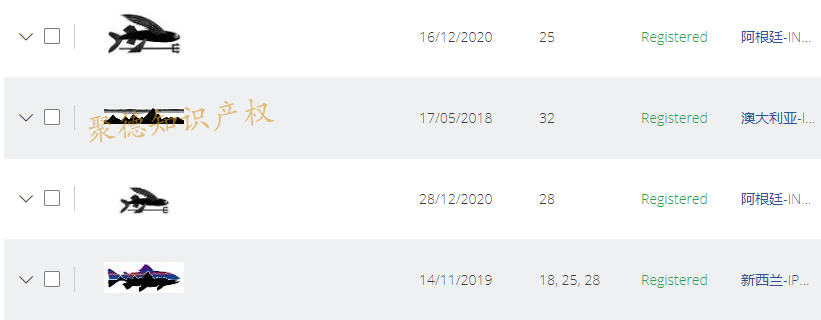 小Jude以“Patagonia, Inc.”关键词检索,查到一共有166件美国商标,还有730件商标分别注册在加拿大、阿根廷、瑞士、澳大利亚、英国、智利、新西兰等国家。