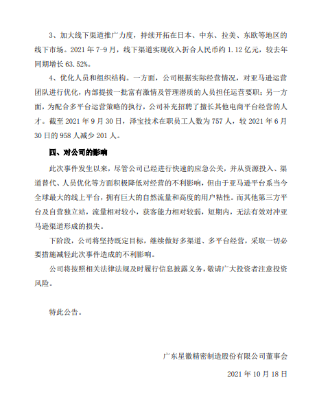 10月18日,跨境电商大卖家泽宝母公司广东星徽精密制造股份有限公司发布《 关于子公司重大事项的进展公告》称,继2021年6月16日泽宝旗下RAVPower、Taotronics、VAVA三个品牌的店铺被亚马逊暂停销售后,另外三个品牌——Anjou、Sable、Hootoo的店铺也相继被封。