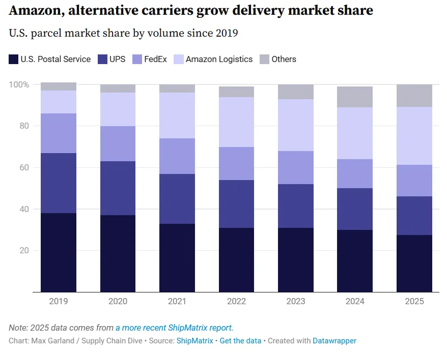 3月,运输咨询与分析提供公司ShipMatrix发布数据报告,2025年,亚马逊的包裹配送量超过USPS,成为美国包裹配送量最大的企业。这标志着一个更大的市场趋势正在形成,即电商公司正在逐渐减少对传统快递公司的依赖。而在此前,亚马逊也已经将大量由UPS处理的最后一公里配送业务纳入自建内部物流网络。