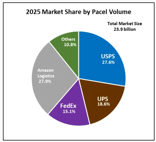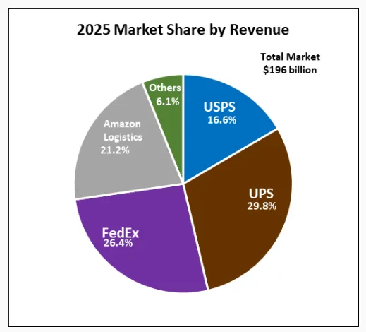 根据ShipMatrix年度研究,美国包裹市场收入达1960亿美元,同比增长4.1%。其中,2025年,UPS的包裹业务收入高达583亿美元,遥遥领先于其他竞争对手,其次是FedEx,收入为571亿美元。亚马逊物流和USPS分别是385亿美元和325亿美元的收入。