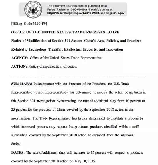 美国时间5月8日早上,美国贸易代表办公室通过联邦政府发文确认了:根据总统的指示,美国贸易代表办公室决定修改301条款调查中采取的行动,将2018年9月公布的中国产品(即2000亿清单)的附加税率从10%提高到25%。执行日期将于美国时间2019年5月10日起。(在后台回复“美国关税清单”即可查看详细清单)