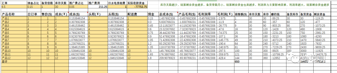 需要自己填写内容进去的,有日均订单,售价,成本,头程费,配送费,汇率,佣金占比,备货倍数,库存天数,推广费用占比,日均水电房租。