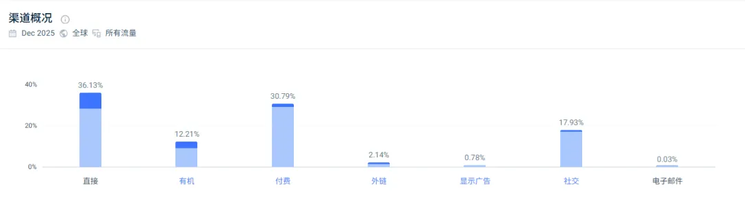 数据显示,官网的直接访问量占比为36.1%,而社交媒体带来的流量约占16%。