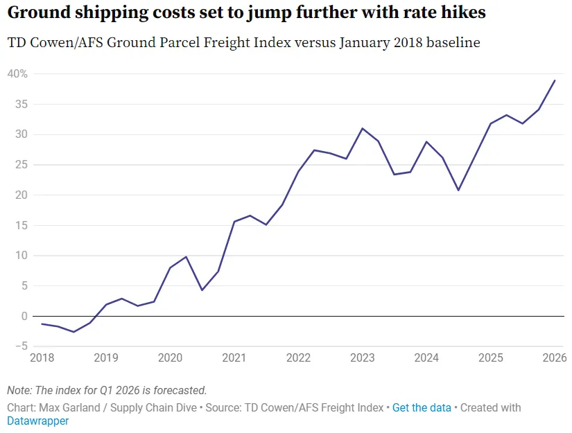 由于综合费率上调(GRI)的上调,今年的地面包裹运输费用预计将会再次上涨。这种费率上调既包括基本费率和附加费的增加,也涉及对某些包裹尺寸所采用的新的收费规则。FedEx和UPS在2026年实施了5.9%的费率上调措施,而且两家的收费标准也基本一致。尽管在某些附加费项目中,比如某些配送区域的费用,FedEx的收费略低一些,但根据TD Cowen/AFS Freight Index的数据,这种差异通常不超过1%。