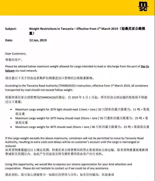 据悉,坦桑尼亚国家交通部将从2019年3月1日起(以卸船日为准)执行新的限重政策,40尺货柜货重不超过25吨,20尺重柜货重不超过25吨,20尺轻柜货重不超过11吨,违者可能会造成延迟交货和罚金!目前,MSC、PIL等各大船公司 已发布紧急通知。