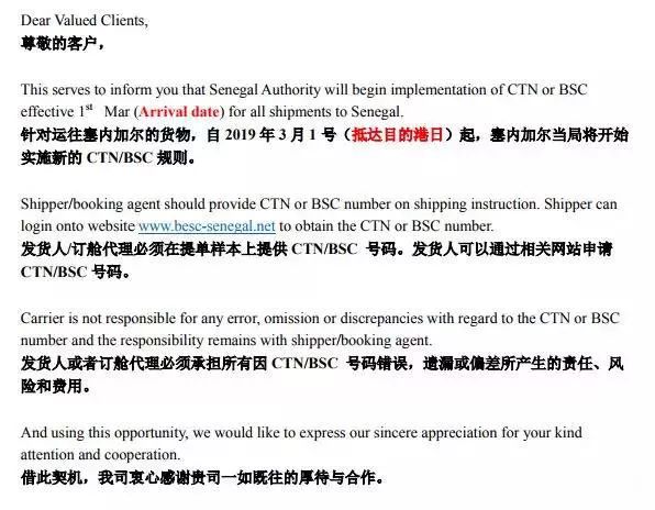塞内加尔当局将自3月1号(抵达目的港日)起实施新的CTN/BSC规则。日前,船公司MSC已发布通知,提醒各位发货人/订舱代理必须在提单样本上提供CTN/BSC号码,发货人可通过相关网站申请CTN/BSC号码。如因号码错误、遗漏或偏差所产生的责任、风险和费用均由发货人或订舱代理 承担。