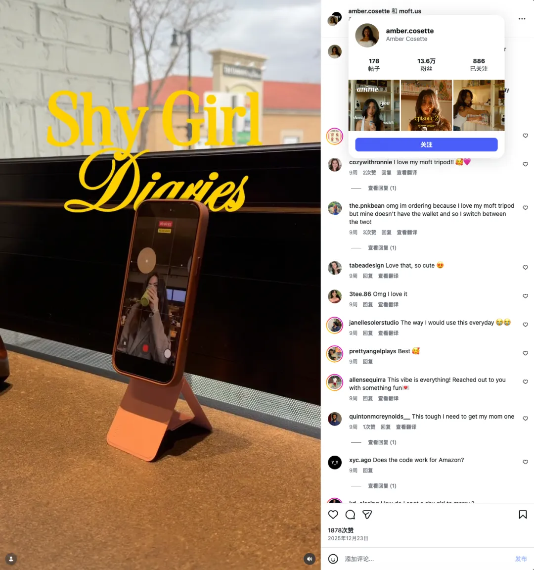 在具体的合作中,Amber没有用传统的套路,例如好看、时尚等角度来介绍MOFT,而是从一个害羞女孩如何拍摄日常生活的角度出发,来证明MOFT的磁吸手机支架是多么的有用。