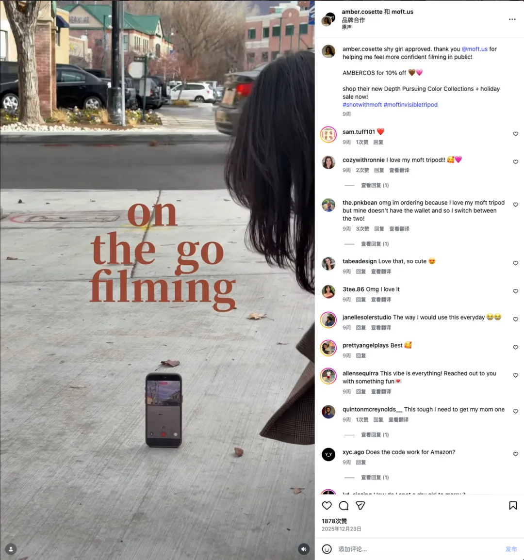 在视频中,Amber用第一、第三人称展示了自己使用MOFT支架,在多个户外场景下的拍摄过程,并贴上了实拍画面,充满毫不吝啬的分享和真诚的态度,打动了不少粉丝。
