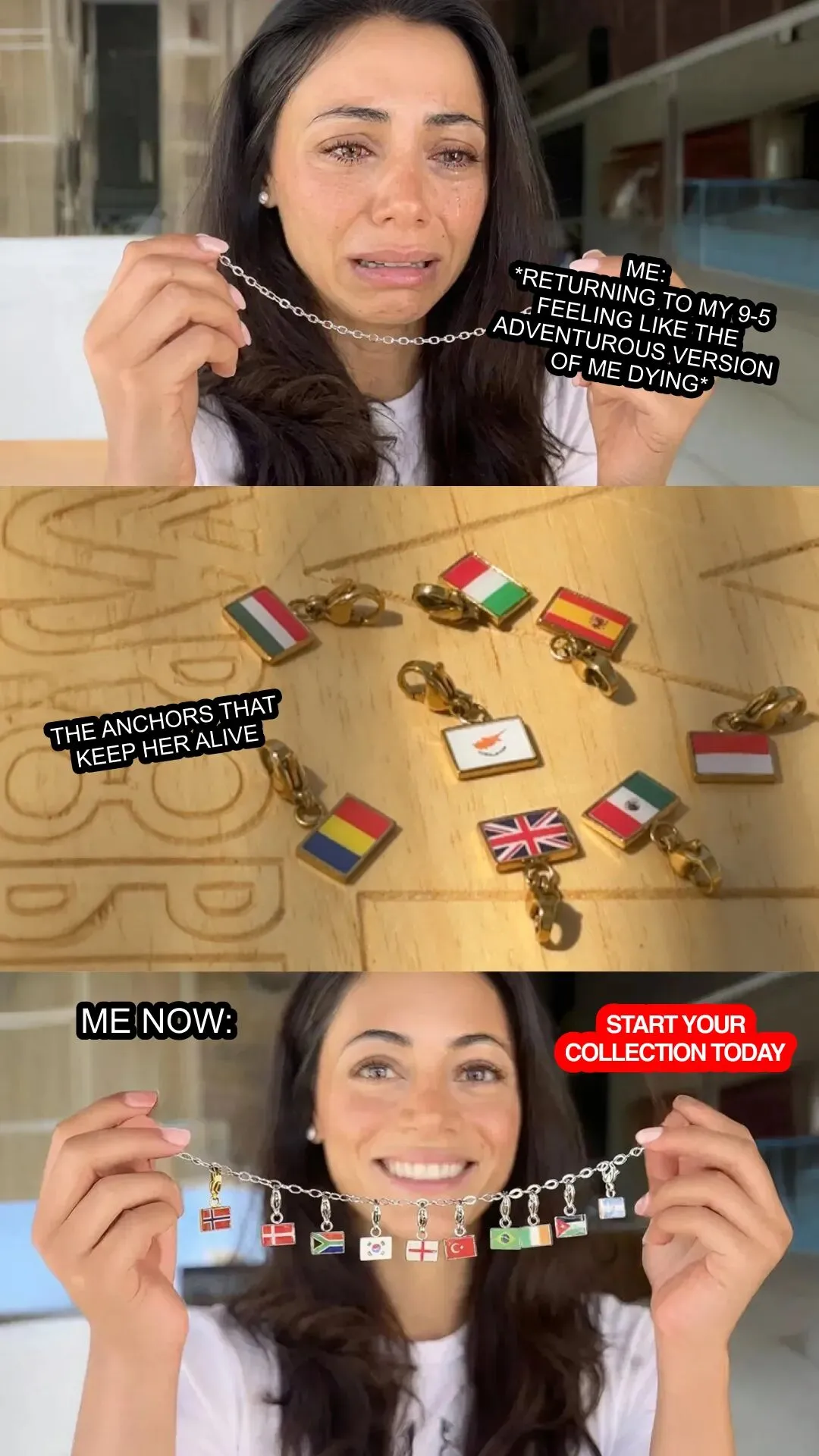 自组吊坠当首饰的产品模式并不罕见,用国旗当饰品也不罕见,把二者结合就显得很特别了。可见品牌很懂用户心理——很多人旅游完回归日常会觉得失落,佩戴挂满旅行纪念的饰品像是一种解药。