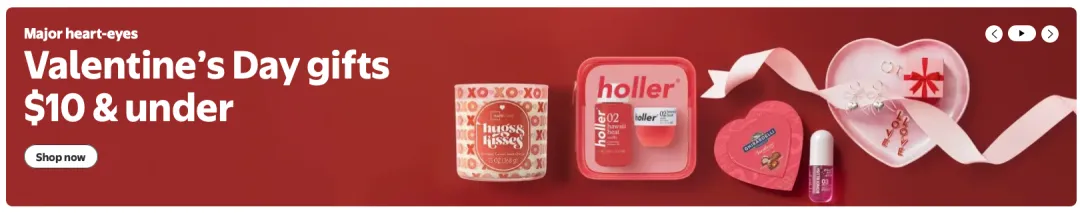 沃尔玛首页最显眼的Banner有两个情人节礼物的栏目,一个是全类目礼品推荐,一个是10美元以下礼物作为主推。
