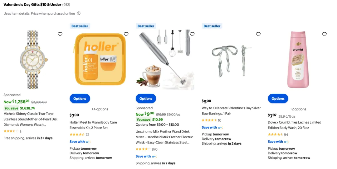 在礼品栏目详情页,沃尔玛情人节礼物的推荐逻辑主要是两个,价格(10元以下),以及热门单品(Best seller)。