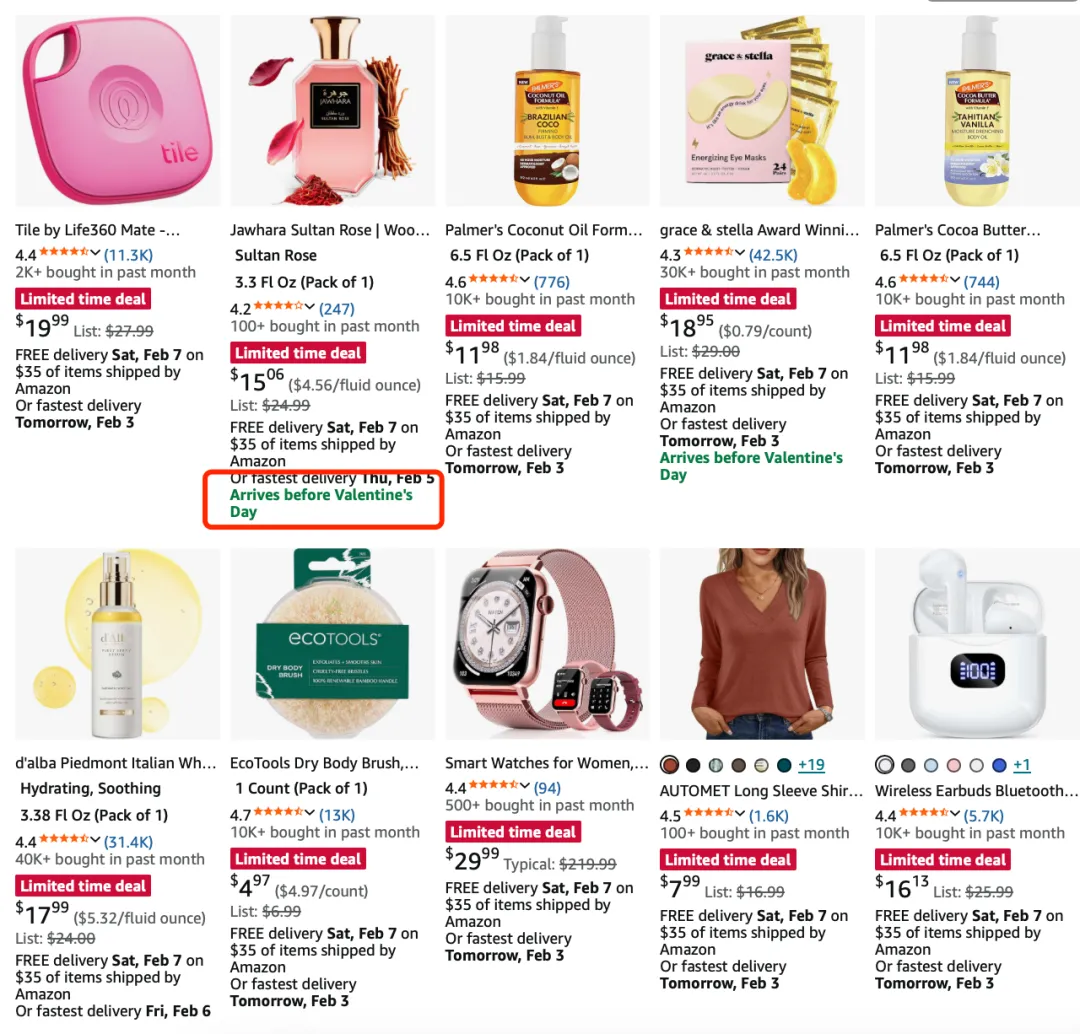 做Deal是获得情人节节日产品流量推荐的首要条件,亚马逊Valentine's Day Gift Shop页面推荐的产品,都有“deal”的标志,部分产品还会特别显示情人节前到达。