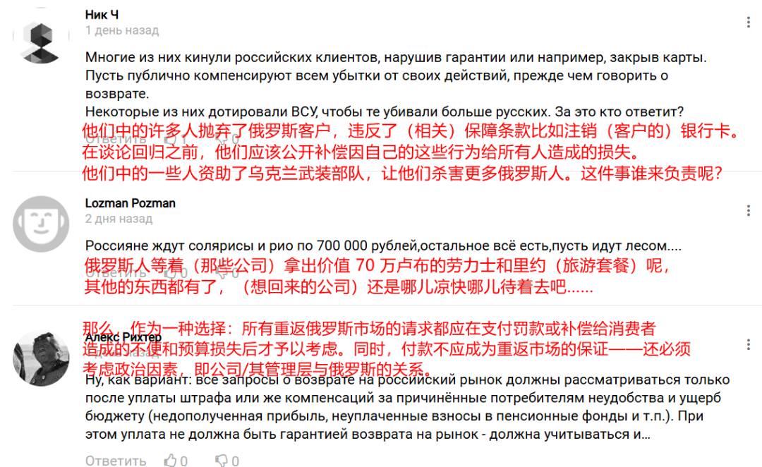 有网友认为,应该对重返俄罗斯的品牌进行严格限制。例如,只允许那些俄罗斯经济目前无法替代的品牌回来,并且应该在在俄罗斯建厂,品牌用俄语名,产品中至少 90% 使用当地原材料和零部件。还有网友指出,企业应该补偿退出时给俄罗斯消费者和财政造成的损失,并公开道歉,不能白白回来。