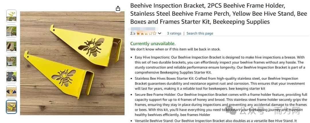 原告KTM Enterprises, LLC是专注于管理养蜂用品、工具和配件的创意公司,创始人不仅是一位养蜂人,更是一位木制和金属工艺品的爱好者,常 以 Happy Bee Innovations 的名义开展业务。Happy Bee Innovations的蜂箱支架是养蜂人不可或缺的实用工具。该支架由实心钢和不锈钢制成,坚固耐用,不易弯曲,能承受蜂箱重量,有效防止因风或动物干扰导致蜂箱翻倒,确保长久的使用寿命,可抵御养蜂过程中的恶劣环境。