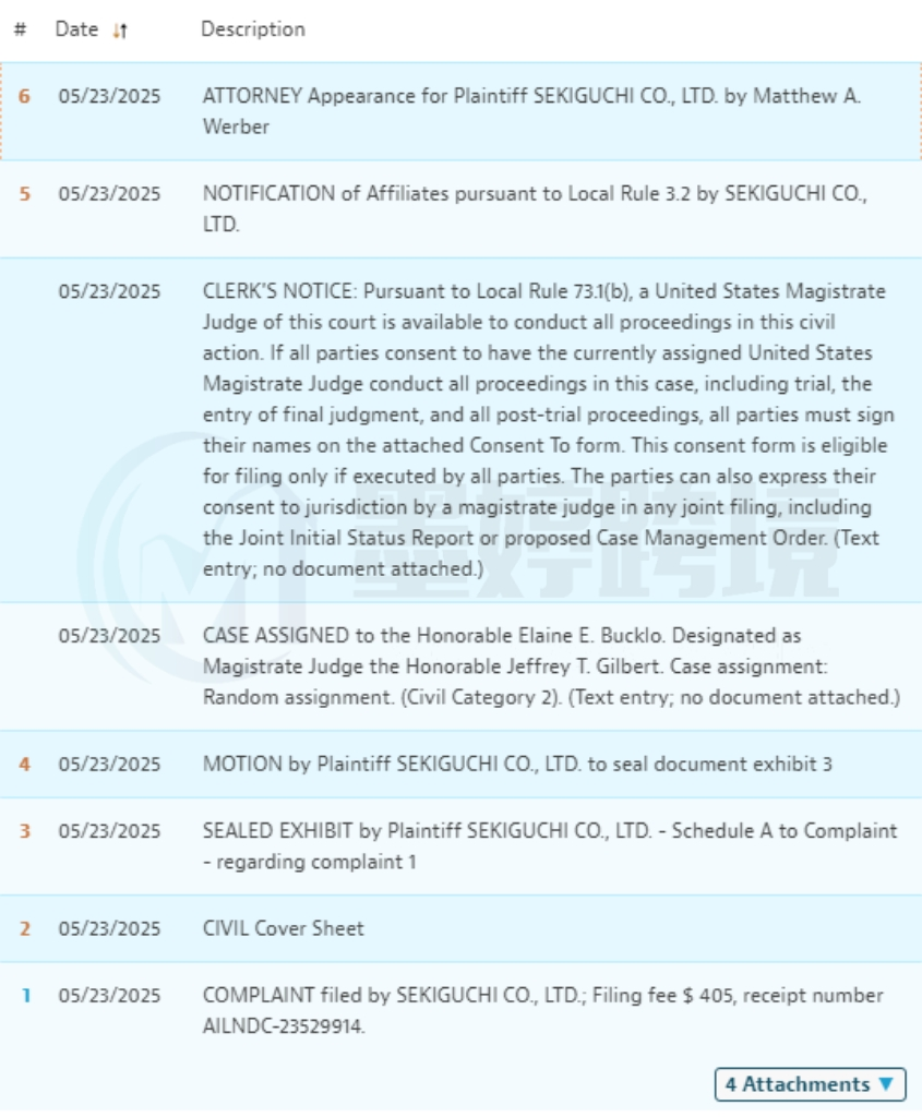 本案于2025年5月23日发起侵权诉讼,案件号:25-cv-05792,原告尚未提起TRO禁令(Temporary Restraining Order,临时限制令)的动议。