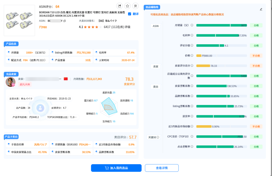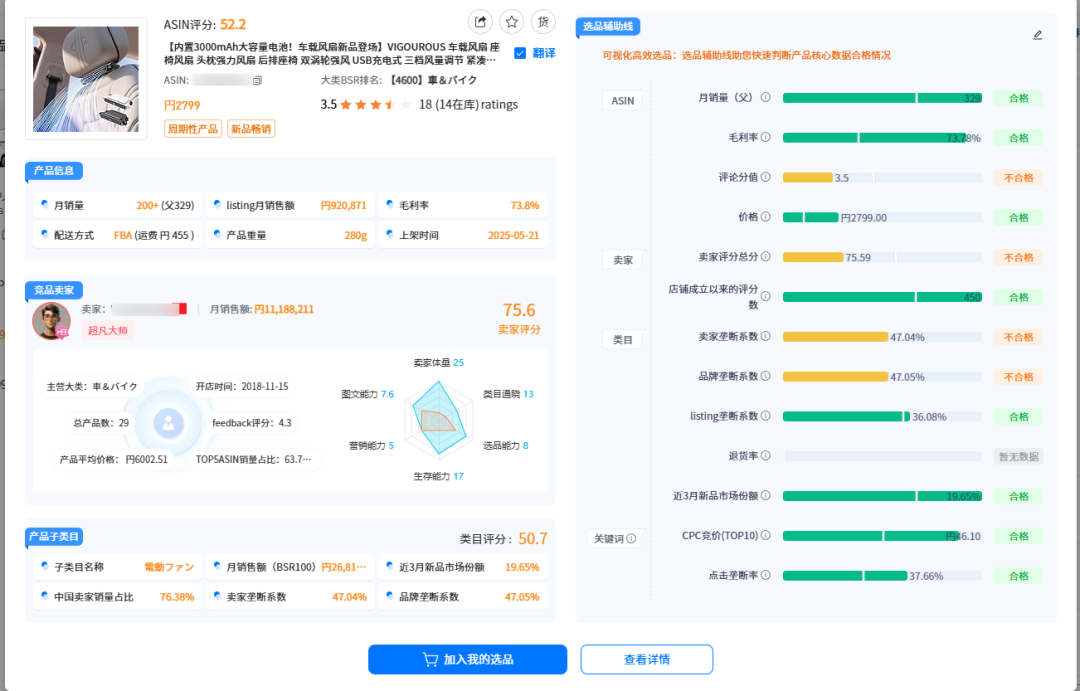只需输入这个表现良好的ASIN,AI系统便会自动扫描汽配大类,从产品竞争力、流量结构、竞争强度、成长性、运营成本等多个维度进行匹配,挖掘出处于近似竞争环境下的其他潜力产品,快速构建一个具有协同效应的“产品矩阵”(如下图)。