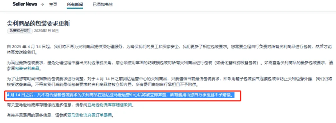 例如,自2025年4月14日起,亚马逊将推行一项新的包装政策,规定所有卖家必须对尖锐商品实施严谨的包装措施,确保员工与消费者的安全。请注意,若包装不符合规定,相关库存可能会遭到销毁,且销毁产生的费用将由卖家自行承担。