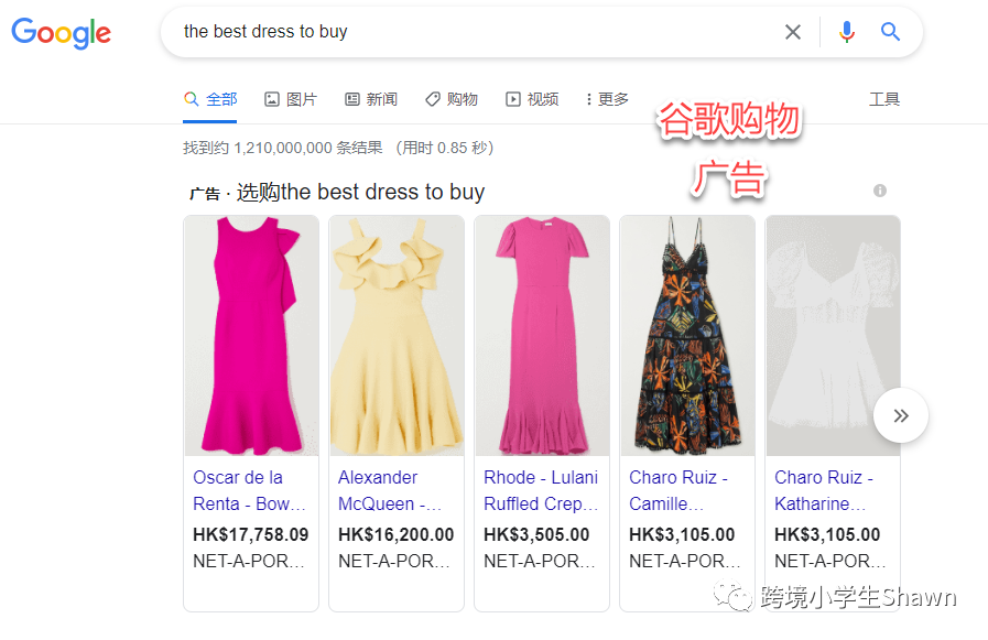 首先,我们来迅速了解一下谷歌购物广告(Google shopping)的实际展示形式,如下图所示