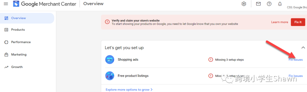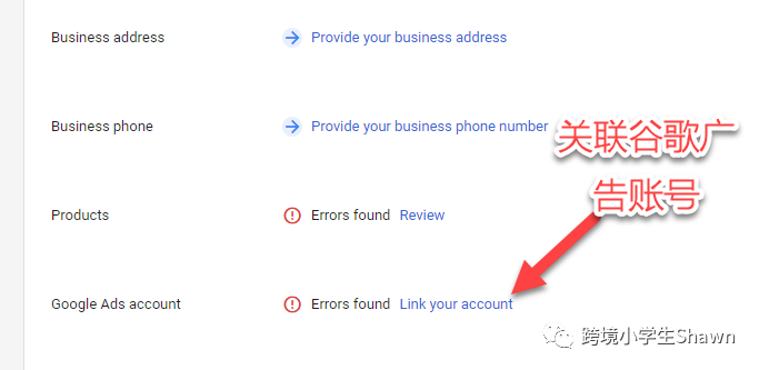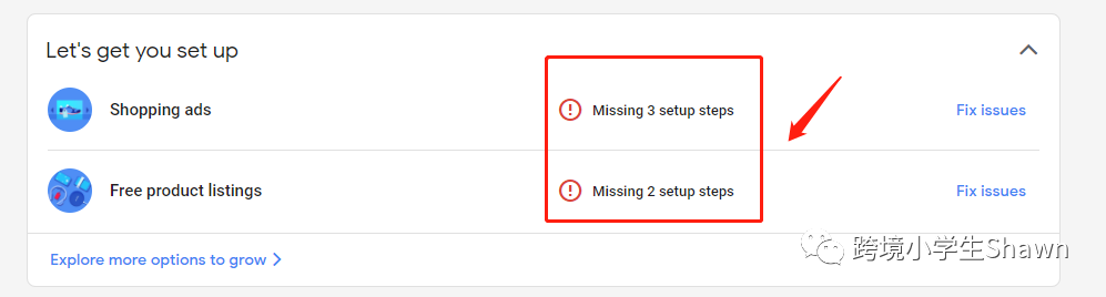 如上图方框中所示,在 Google Merchant center中待完善的项目要逐一排查
