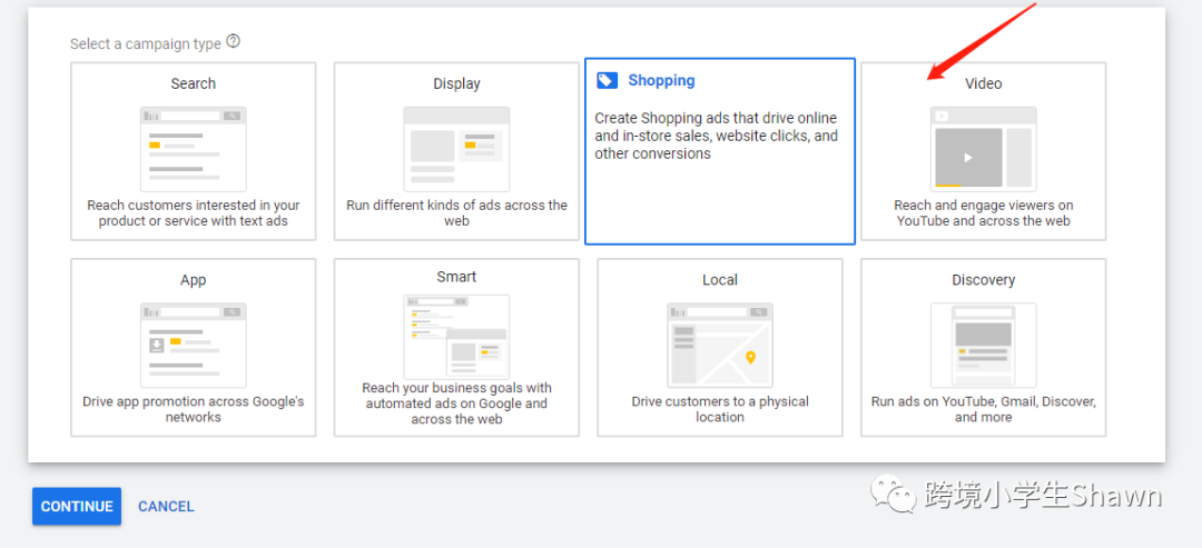 点击 Video Campaign 后,会出现以下视频广告形式进行选择