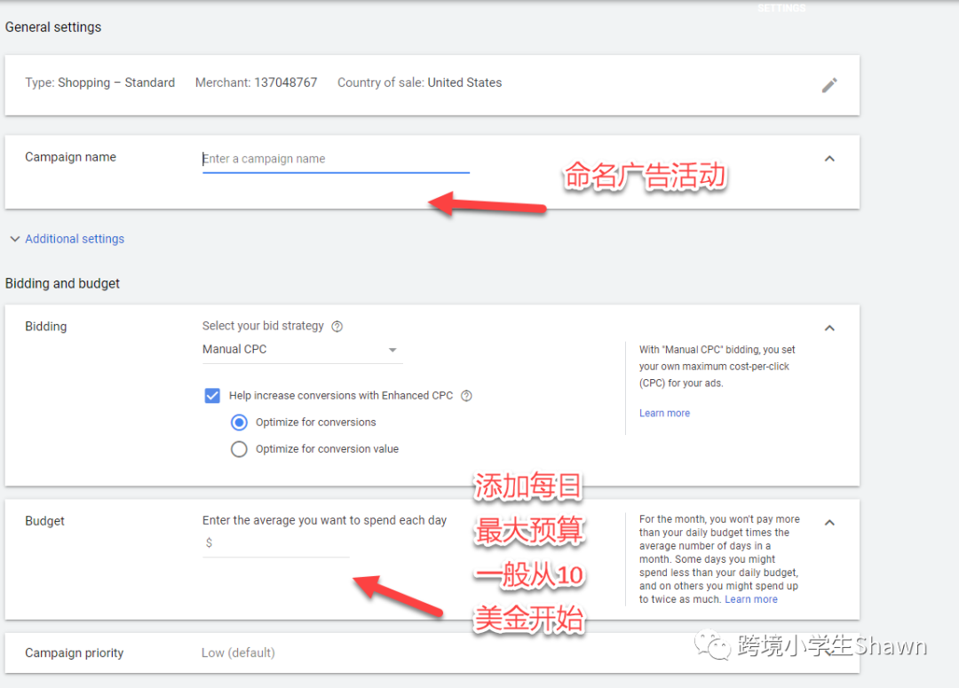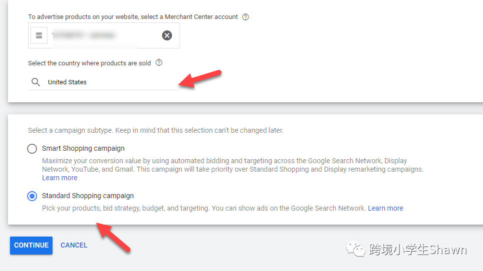 在下方选择好目的销售国及 Standard shopping Campaign后点击continue