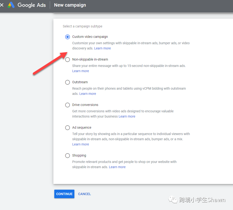 一般来讲,我们选择 Custom video Campaign 就可以了,我们可以自行选择广告的形式,然后点击continue后进入下一页