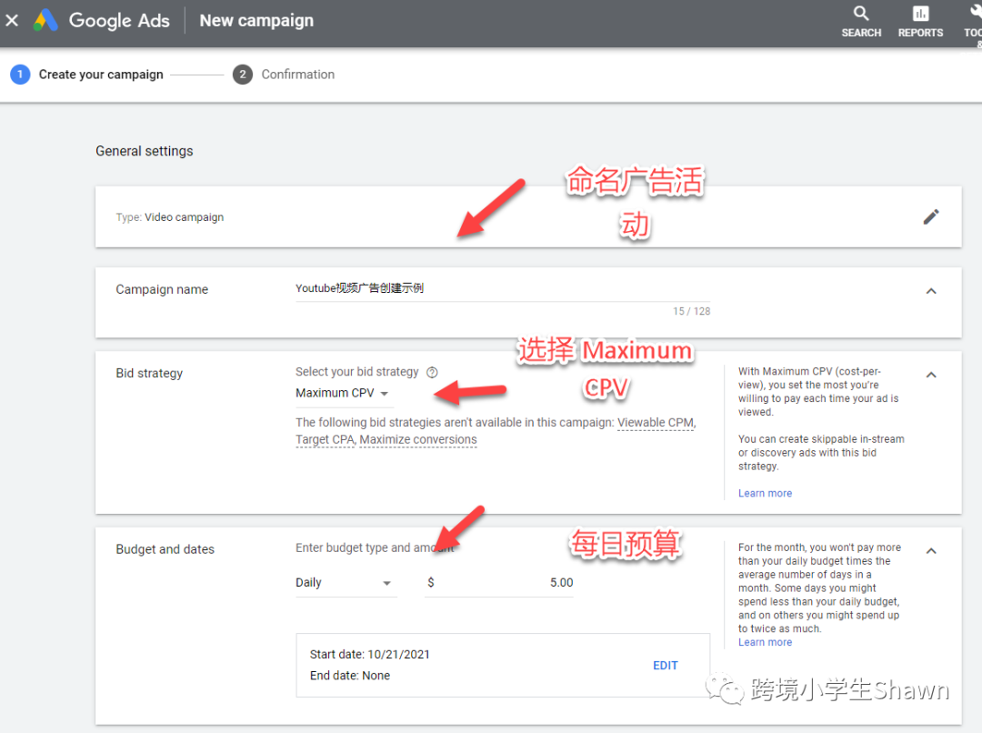 如上图所示,依次命名广告活动,选择竞价策略 Maximum CPV ,为每次的观看量计费。