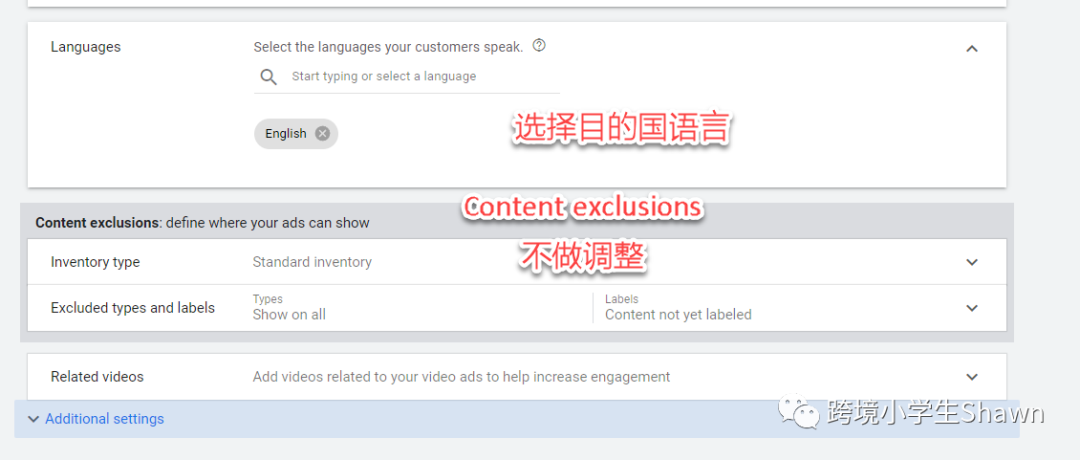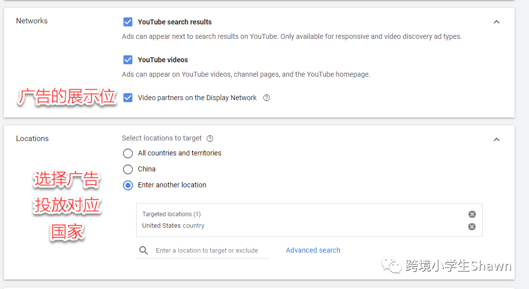 然后点击上方的蓝色加号,依次添加目的销售国、语言及广告展示位置