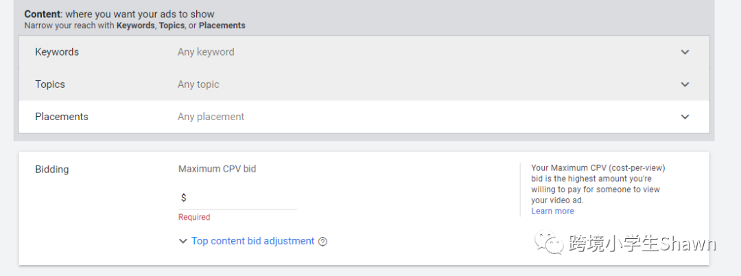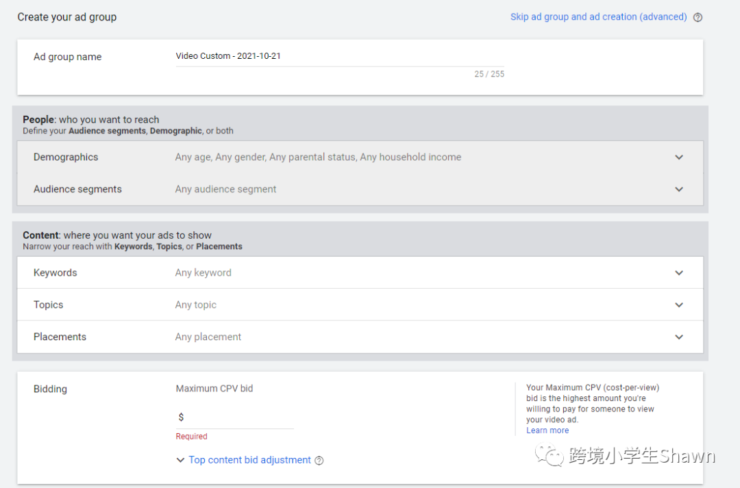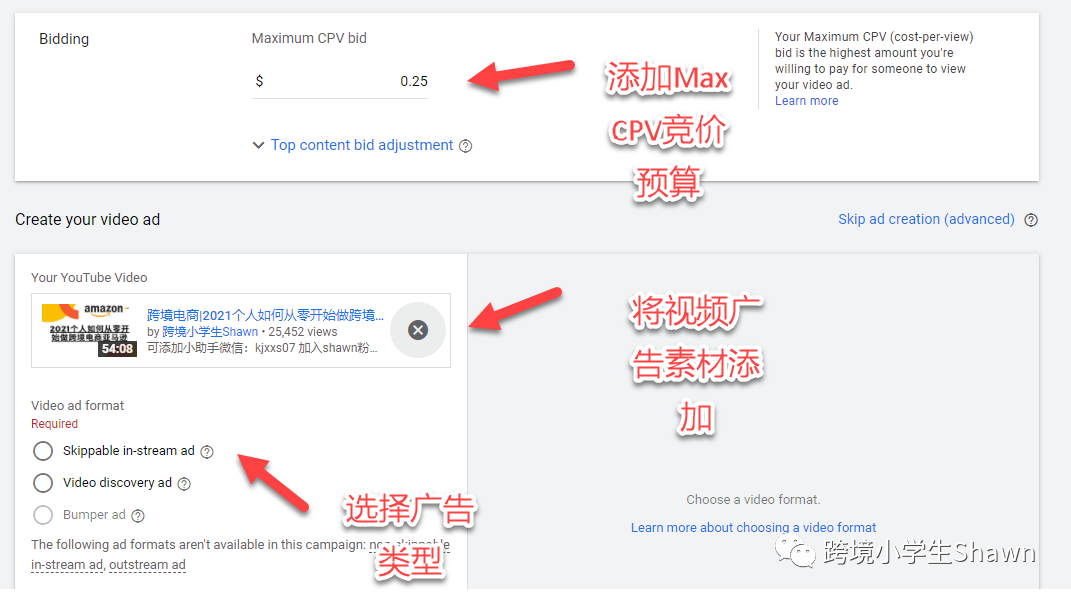 添加Max CPV的单次最大出价,将我们用于投放广告的YouTube 视频链接添加。