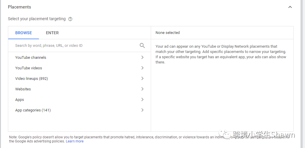 Keywords层面选择与我们产品相关的关键字;Topics选择与我们产品相关的话题;Placements 则是只作为广告主,我们可以定向将广告投放在主要竞品那里,或网站 App等如下图所示