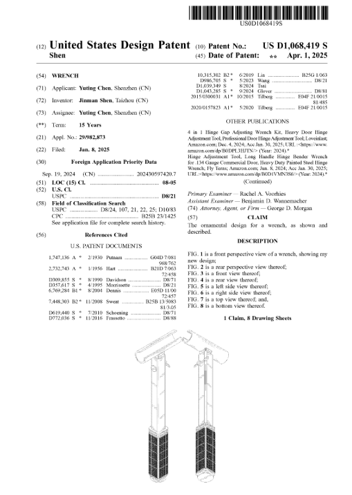涉案专利为铰链调节扳手,专利号是 US D1,068,419 S,注册日期为2025年1月8日,下证日期为2025年4月1日。以下是专利详情,跨境卖家选品时需注意,未经授权切勿上架!