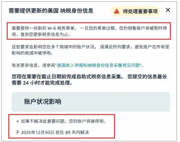 最近好多做亚马逊美国站的朋友都急了,后台突然弹出一个红色警报,催着更新一个叫 W-8 的税务表格。不赶紧处理,店铺可能真会被停掉。