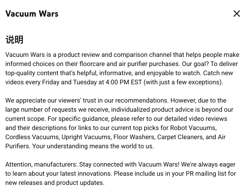 从频道内容和受众结构来看,Vacuum Wars的YouTube频道以深度评测和对比类内容为主,主题集中在机器人吸尘器、无线手持吸尘器、地面清洗机等清洁设备,兼顾专业性与实用性。