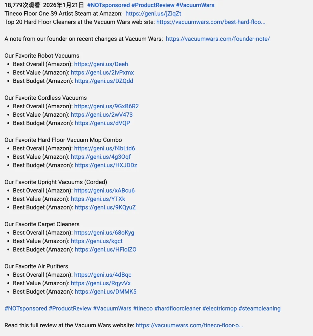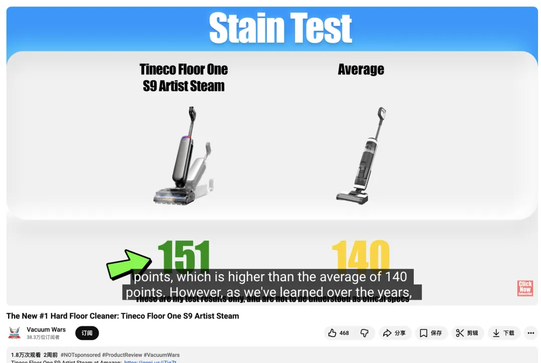 视频明确标注了合作属性,但内容本身依然围绕专业评测展开,没有破坏观众的观看体验——实拍Floor One S9 Artist Steam等新品在地板、沙发底等真实场景的清洁效果,用量化数据凸显性能优势,将其与戴森、Shark等国际大牌同台对比,同时在视频描述和置顶评论附上购买链接,实现种草与导流的自然衔接。