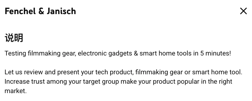 Fenchel & Janisch 并非单纯的内容创作者,更是一家扎根法兰克福的影视制作公司,同时以影像制作为核心运营达人账号,拥有26.3万订阅者及丰富的内容储备,专业性与传播力兼具,成为 JONR 展会推广的最优选择。