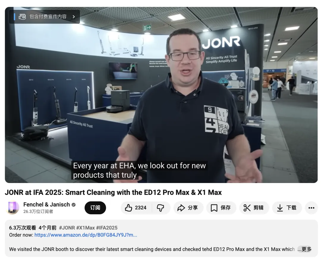 同时,其视频配备双语字幕,能有效触达国际受众,恰好契合 JONR 依托 IFA 展会拓展海外市场的核心目标。