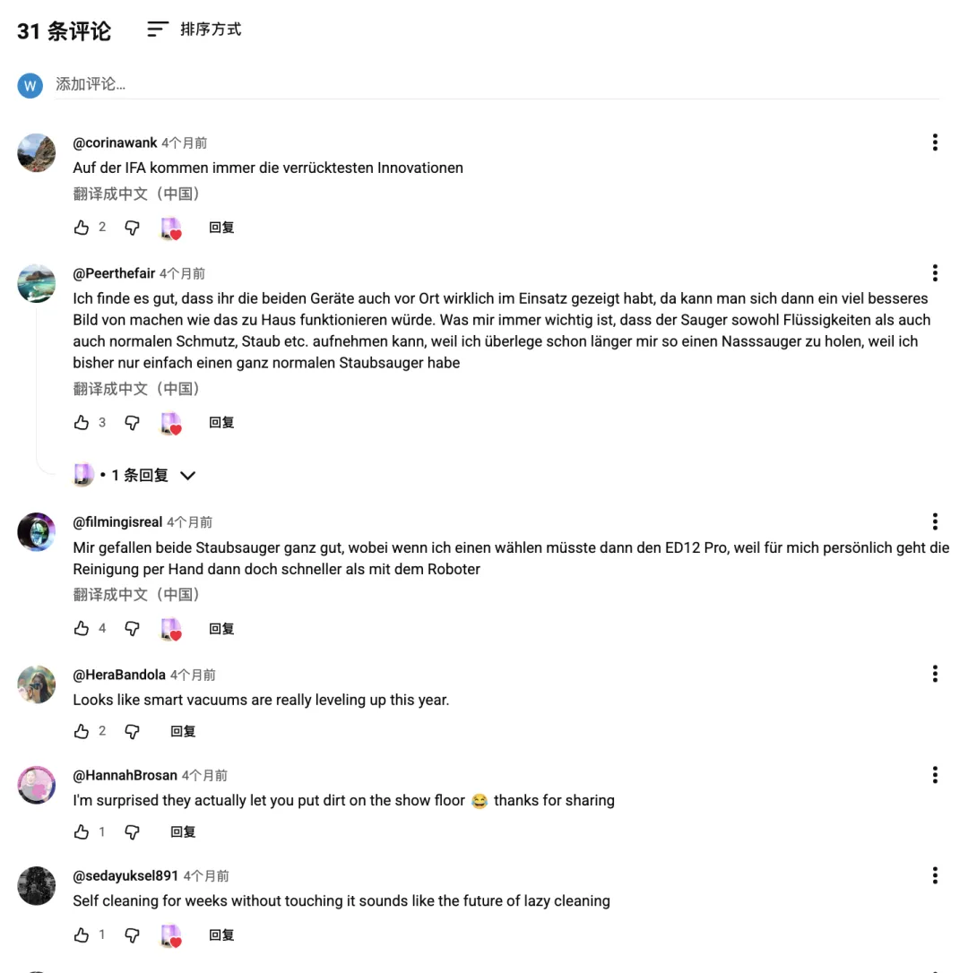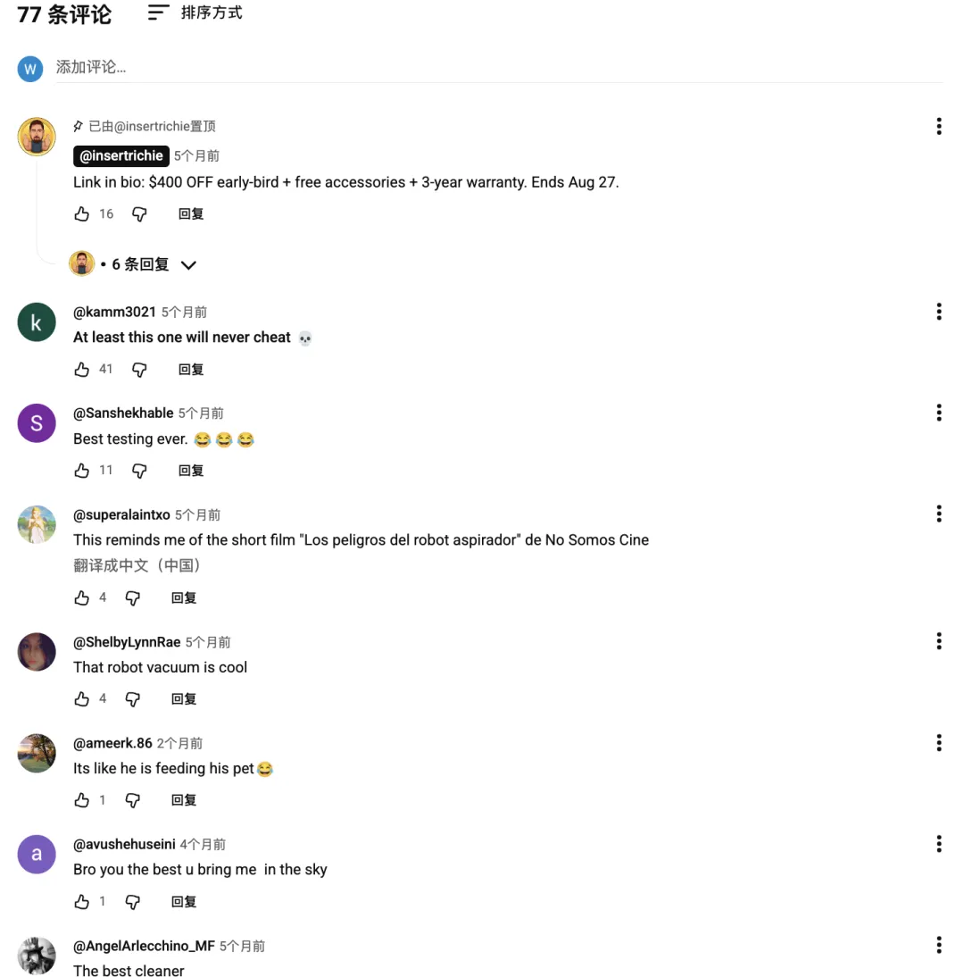此次合作的流量与转化成效十分亮眼:单条合作视频斩获约57万次播放,以及1.1万次点赞,共收获 77 条评论,且互动质量极高,多数观众留言表达赞赏与喜爱,如“That robot vacuum is cool”“Best testing ever”,同时有大量用户关注优惠力度与保修政策,购买意愿明确。