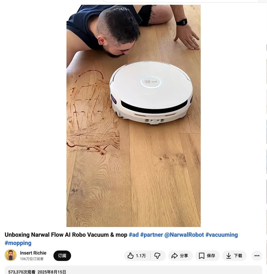 除了居家场景种草、展会现场推广,以娱乐化、生活化见长的头部达人,同样能为科技品牌出海注入强劲动力——Narwal(云鲸)便携手百万订阅量开箱博主 Insert Richie,以轻松有趣的内容形式,实现了品牌曝光与转化的双重突破,进一步印证了“达人精准匹配”的核心价值。
