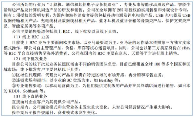 海翼电商为国内和海外消费者提供包括移动电源及锂电相关产品、USB 充电器及 USB数据传输相关产品、充电线材及数据线材相关产品、蓝牙耳机及蓝牙音箱等音频类产品、保护支架类产品、智能家居类等多项产品。公司主要销售渠道包括线上 B2C、线下批发以及线下直销。