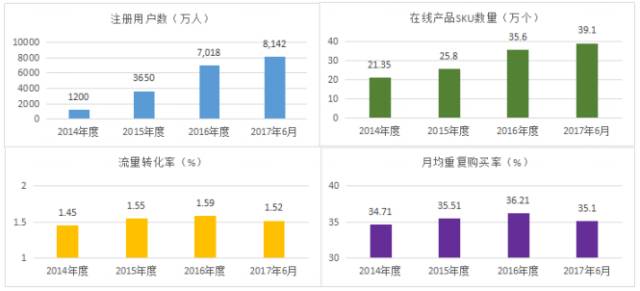 公司目前拥有Gearbest、Zaful、Rosegal、Dresslily等多个自建专业品类垂直电子商务销售平台。截止2017年6月30日,旗下平台合计注册用户数量超过8,142万人,月均活跃用户数超过1,680万人,在线产品SKU数量超过39.1万个;2017年上半年公司旗下主要平台重复购买率35.1%,流量转化率为1.52%。2014-2017.6自营平台数据如下: