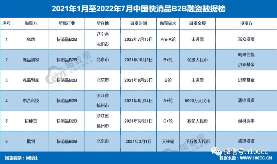 据“电数宝”电商大数据库(DATA.100EC.CN)显示,2021年1月至2022年7月,国内快消品B2B领域共发生了6起投融资事件,融资总额超3.6亿元。涉及的公司包括:兔悠、冻品到家、惠合科技、拼便宜、批到等。