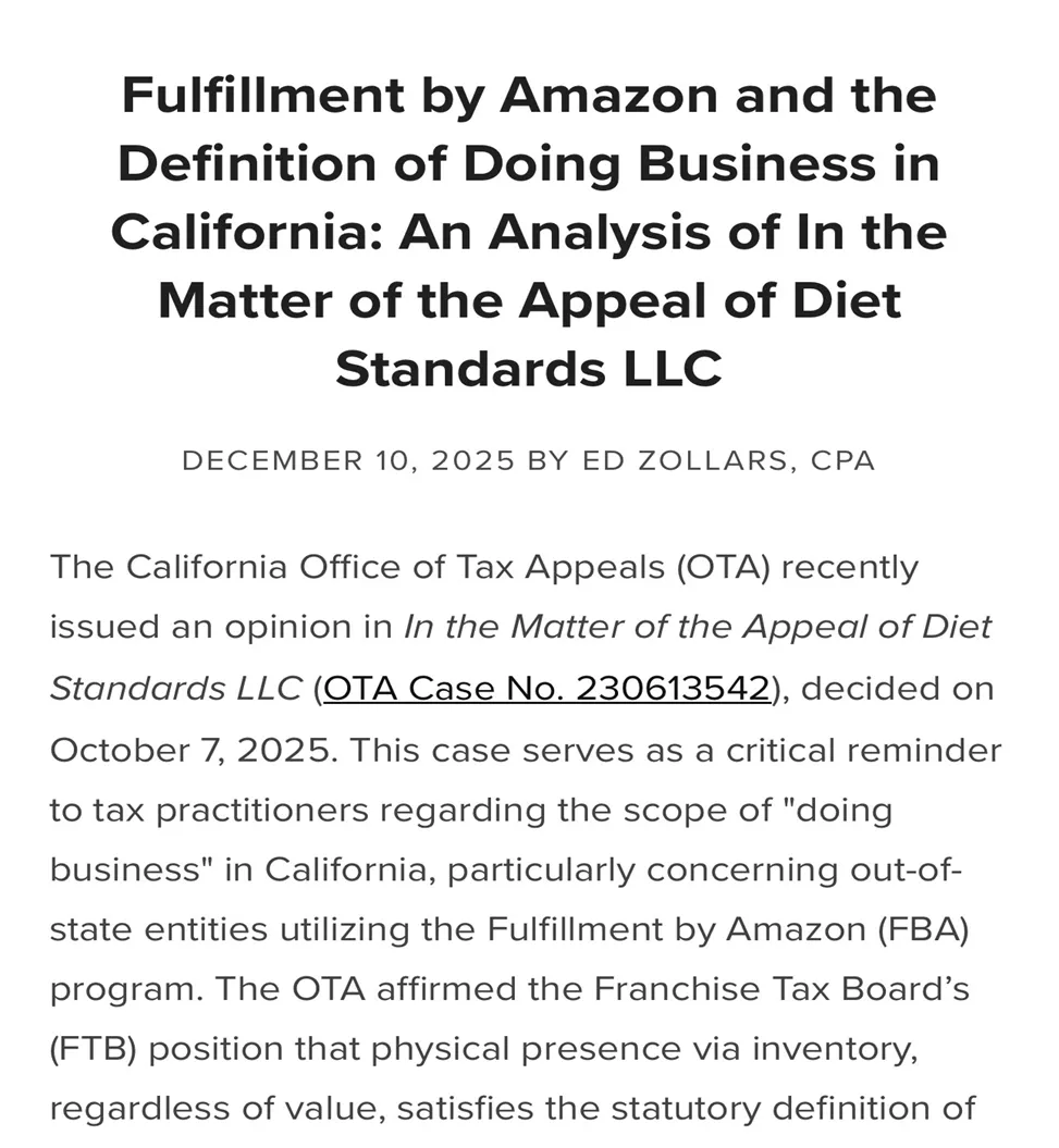 这不是猜测,而是2025年10月加州税务上诉委员会(OTA)的正式裁决。一家在加州销售额仅1.4万美元、库存价值仅2333美元的佛州公司,因使用FBA,被判定在加州“从事业务”,需缴纳800美元年度税及罚款。