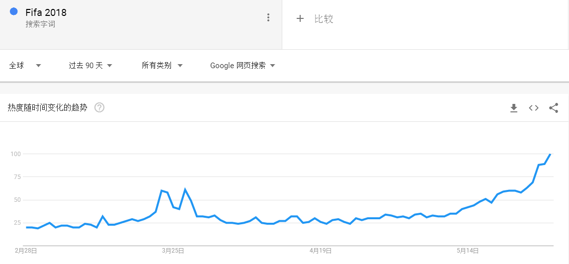 随着开幕时间的临近,“世界杯”的相关搜索量大幅上升,在谷歌趋势上,“Fifa”和“Fifa 2018”的搜索热度均持续飙升,下图为后者在过去90天的热度变化趋势: