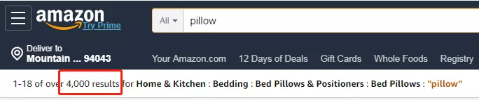 当你在亚马逊搜索框输入你想要卖产品的关键词时,看查询出来的产品数,产品数在6K以上是她的一个指标考量,当然3000-6000也可以选择。