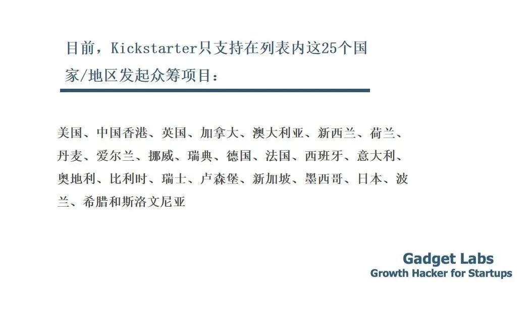 目前,Kickstarter只支持在列表内这25个国家/地区发起众筹项目:美国,中国香港,英国,加拿大,澳大利亚,新西兰,荷兰,丹麦,爱尔兰,挪威,瑞典,德国,法国,西班牙,意大利,奥地利,比利时,瑞士,卢森堡,新加坡,墨西哥,日本,波兰,希腊和斯洛文尼亚。