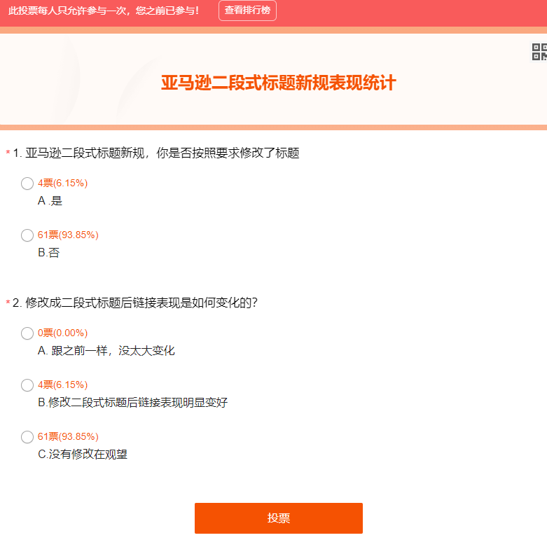 我们来看一下我们昨天收集的卖家标题新规的反馈。 你可以点击链接参与投票和查看结果: https://tp.wjx.top/vm/OvifvsZ.aspx#